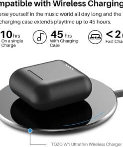 [45Hrs Playtime Endurance] Playtime lasts for over 10 hours from single charge and total 45 hours with charging case, which can listen to up to 675 songs or dive into 10,800 short videos. Enjoy fast charging, to fully charge the rechargerable case only 55 minutes via USB-A to Micro USB charging cable or less than 2 hours via wireless charger. Providing convenient charging way with no strings attached.