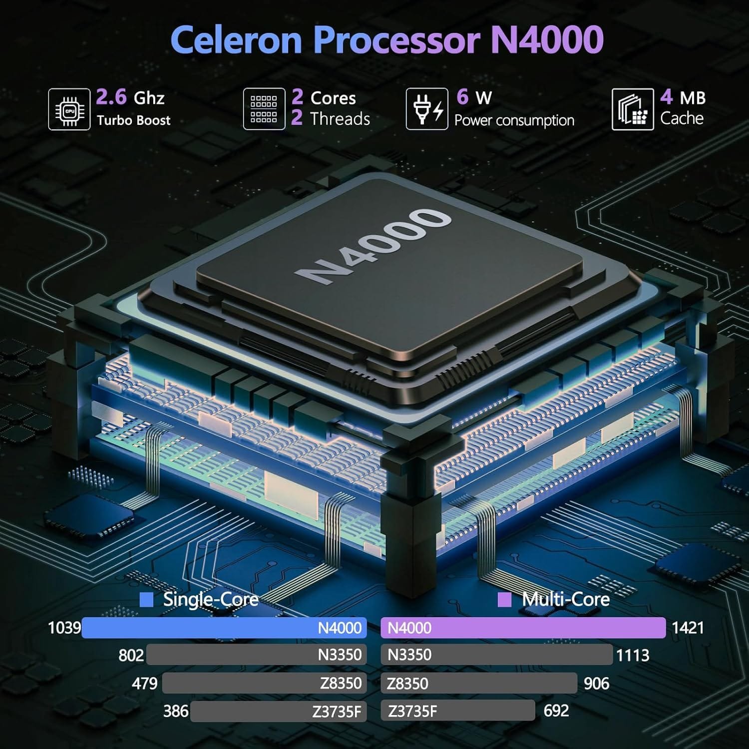 SMOOTH AND EFFICIENT DAILY OFFICE WORK:Laptops celeron N4000 processor up to 2.6GHZ,can easily handle daily office tasks such as document editing,web browsing,email sending and receiving etc.It can also maintain a good response speed during multitasking,making your work more efficient