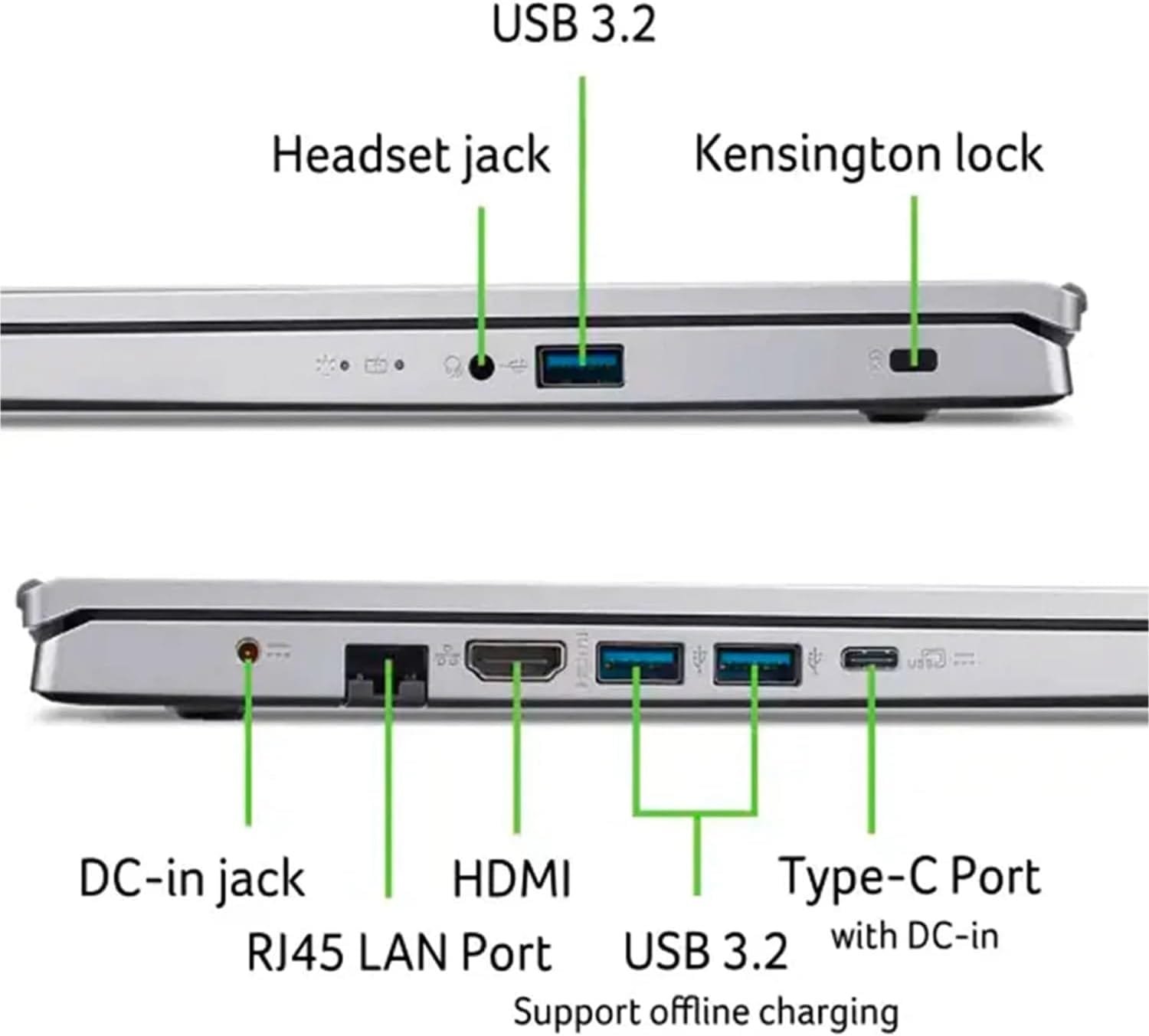 Ports For All Your Accessories: 1 – USB Type-C Port USB 3.2 Gen 2 (up to 10 Gbps) DisplayPort over USB Type-C & USB Charging, 2 – USB 3.2 Gen 1 Ports, 1 – HDMI 2.1 Port with HDCP support, 1 – Headphone/Speaker/Line-Out Jack, 1 – Kensington Lock Slot, 1 – DC-in for AC adapter