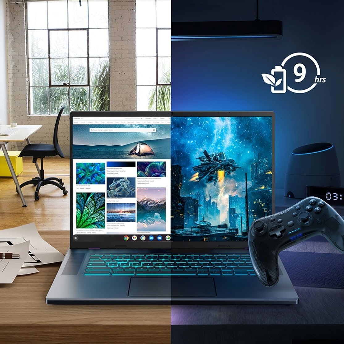 [...]I didn’t buy this for gaming, I needed a Chromebook Plus for myself. I did buy it because it has great specs at a great price, & it didn’t disappoint! Good build quality & a nice Keyboard. Screen is very sharp & good for my eyes, though I EXPECTED it to be Touch based on its original price. Battery life is very long with just web based tasks. Overall a very good purchase in the $500 price range. Included Controller is nice because at the the end of the day, this is my personal device :)