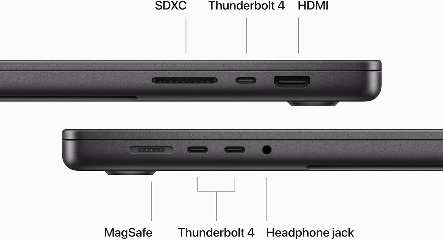 CONNECT IT ALL — This MacBook Pro features a MagSafe charging port, three Thunderbolt 4 ports, an SDXC card slot, an HDMI port, and a headphone jack. Enjoy fast wireless connectivity with Wi-Fi 6E and Bluetooth 5.3. And you can connect up to two external displays with M3 Pro, or up to four with M3 Max. (Wi‑Fi 6E available in countries and regions where supported.)