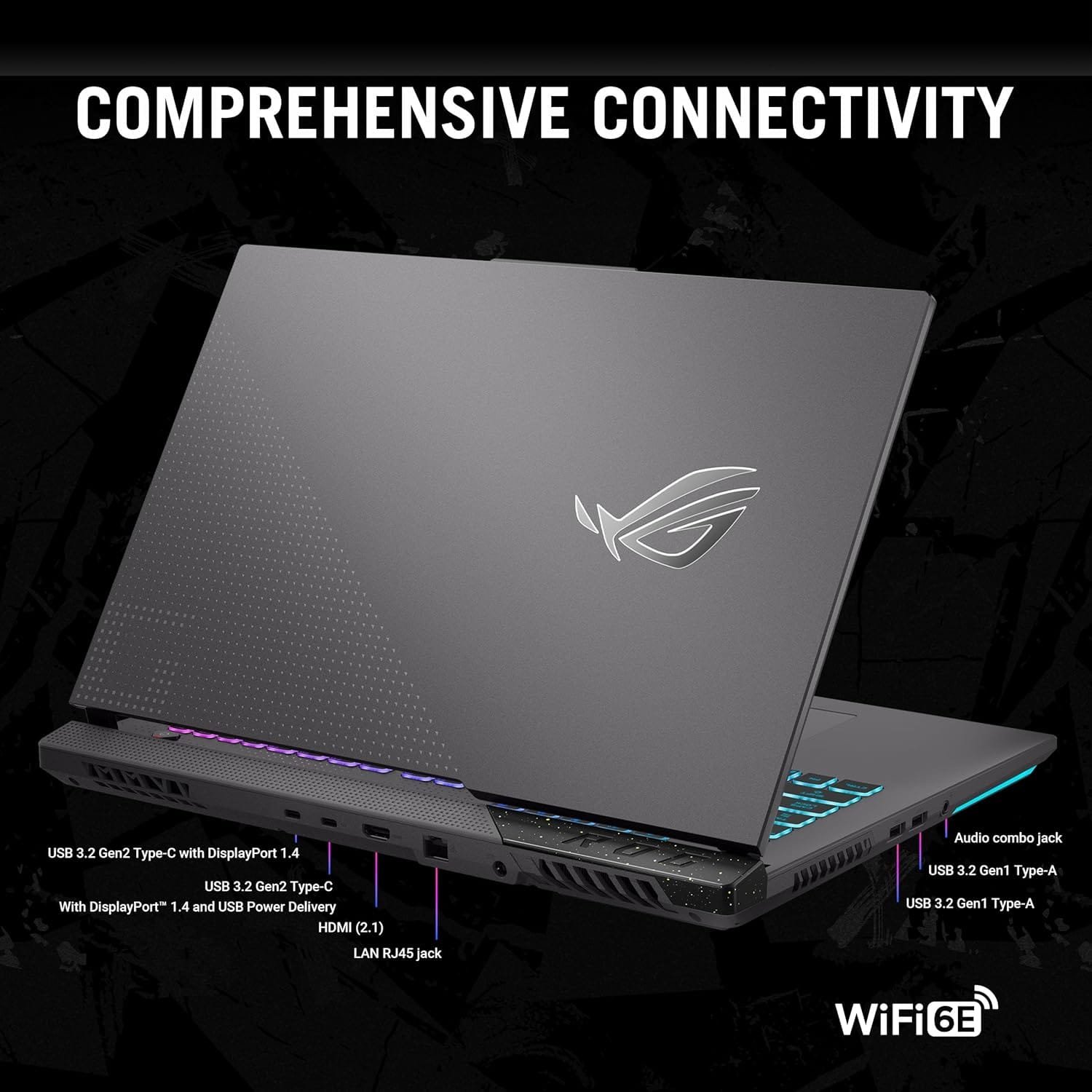 [Tech Specs] 1x USB 3.2 Gen 2 Type-C support DisplayPort / Power Delivery, 2x USB 3.2 Gen 1 Type-A (USB 5Gbps), 1x USB 3.2 Gen 2 Type-C with support for DisplayPort(USB 10Gbps), 1 x HDMI 2.1, 1 x Headphone/Microphone combo, 1x RJ45 LAN port, 720p HD Camera, Wi-Fi 6 and Bluetooth, Dolby Atmos, AI noise-canceling technology, RGB Backlit Keyboard with Aura Sync Light Bar