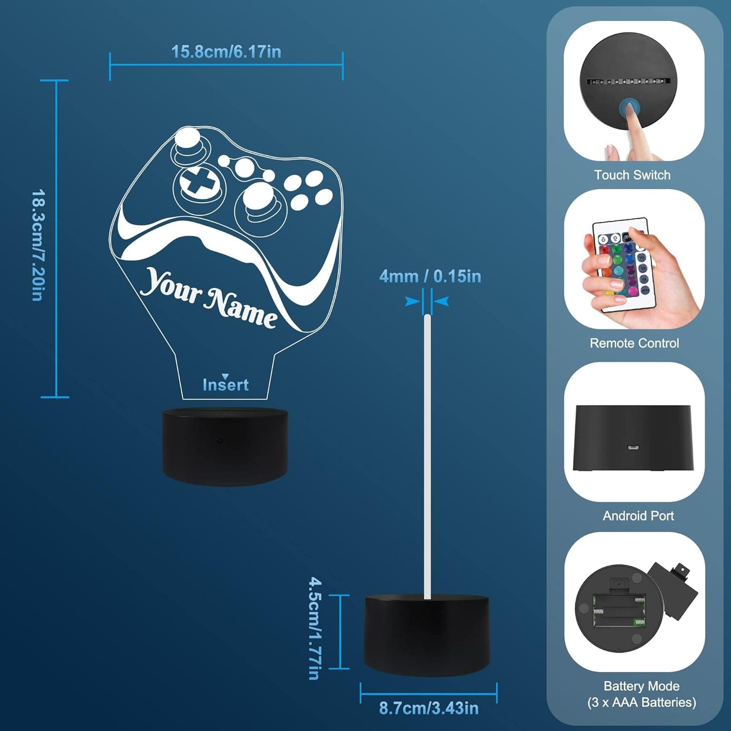 🎮【Remote Control+Timer+Dimmer+Smart Touch】Newly upgraded version gamepad night light can be set free from 15 minutes to 12 hours. The 3d lamp has 16 colors changing and 4 kinds of flashing, and you can adjust the light brightness to decorate Kids’ rooms, bedrooms, living rooms, etc, and not impact your sleep
