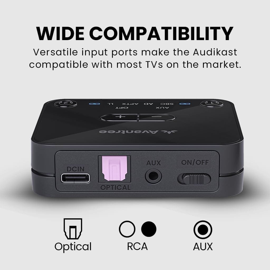 [WIDE COMPATIBILITY] The Audikast 3 supports TVs with optical (TOSLINK) and AUX (3.5mm) audio output ports. Please check your TV’s audio output options before purchase to ensure compatibility. With this product, you can connect Bluetooth headphones or earbuds to the transmitter and enjoy audio from your TV wirelessly.