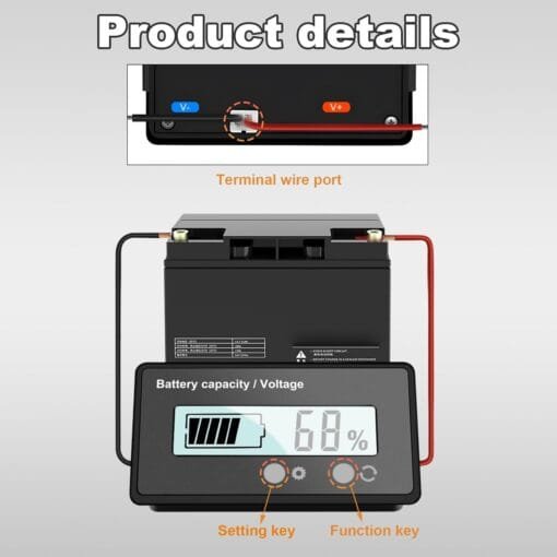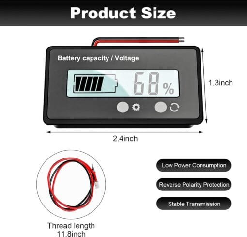 【Practical Design】: Our battery capacity meter has an on/off function button on the front side, which can be pressed to view the battery capacity or real-time voltage and turned off. It has an alarm design, the battery meter display blinks when the battery capacity is low. There are also functions to turn on the backlight, hibernation mode, battery type selection and more, which makes it practical.