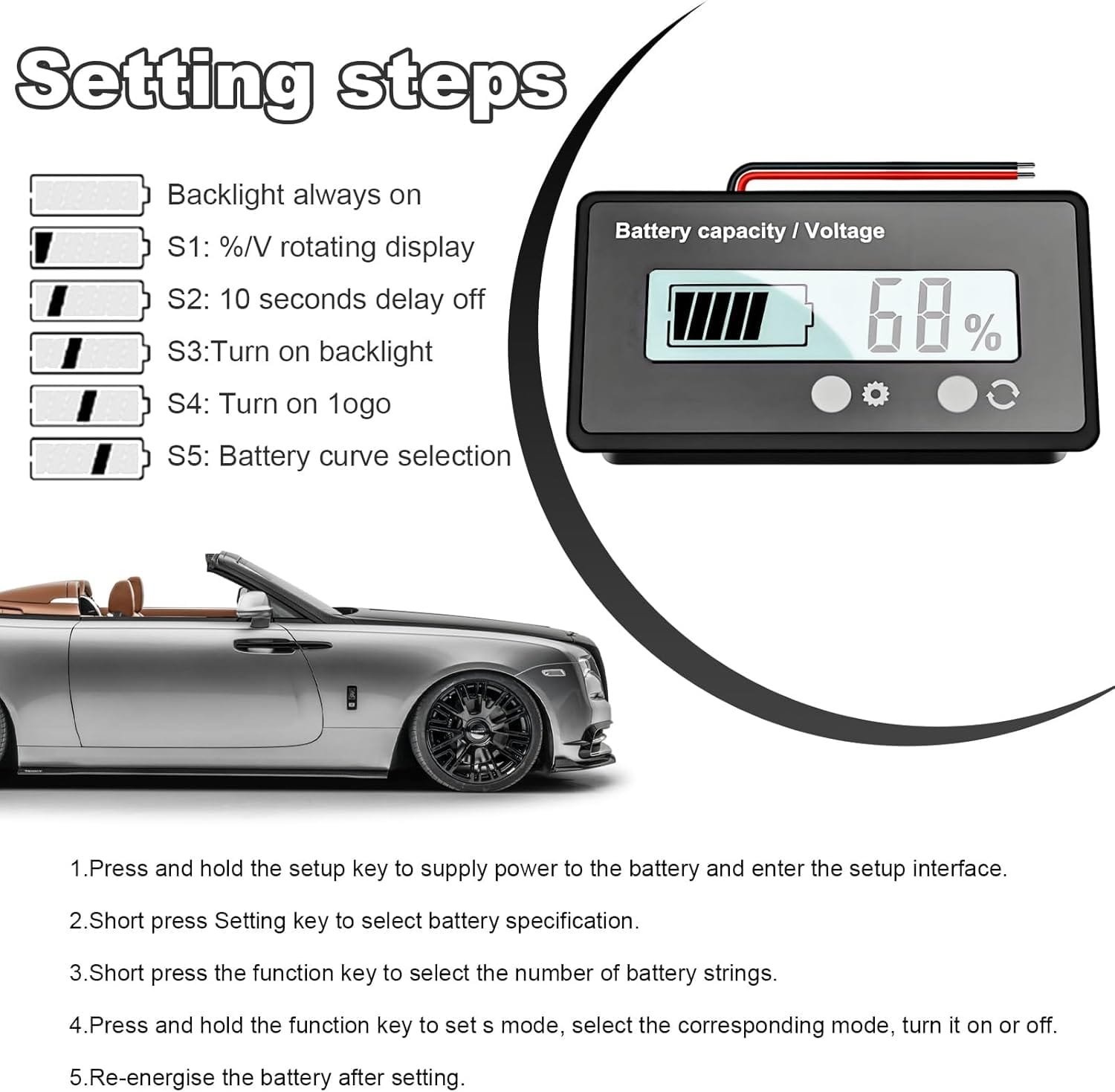 【Setting Steps】: At first, press and hold the setup key to supply power to the battery, and enter the setup interface. Then, short press the setup key to select the battery specification; short press the function key to select the number of battery strings. Next, long press the function key to set S mode, setup key to select the corresponding mode, function key to turn on or cancel. Finally, just reconnect the power after setting.