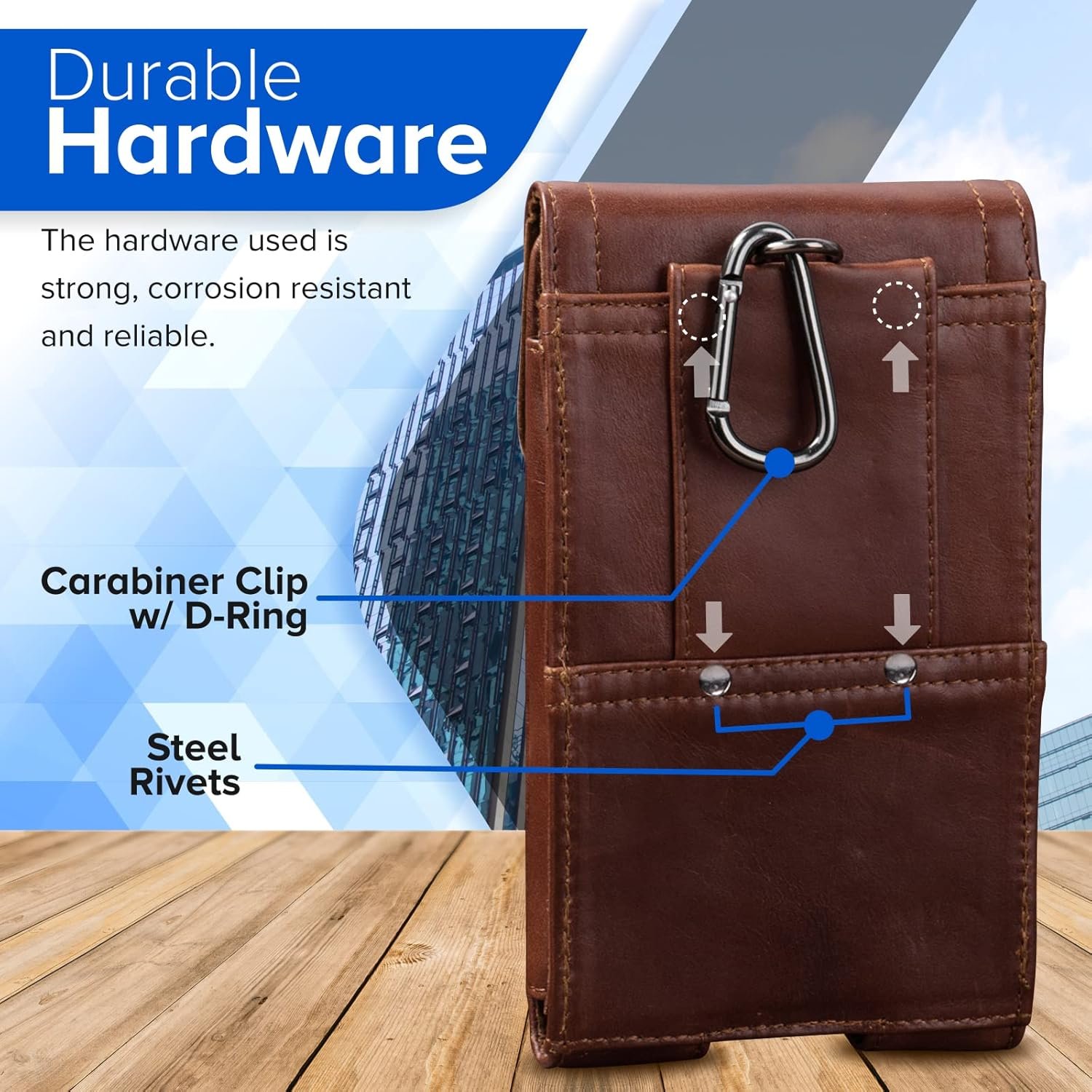 Hardware: Flap cover is secured with a strong magnetic snap holds tightly. Belt loop reinforced with 4 metal rivets for extra strength and prevents from tearing off. Comes with a heavy-duty carabiner clip held by a D-ring keeping it firmly attached to the phone holster