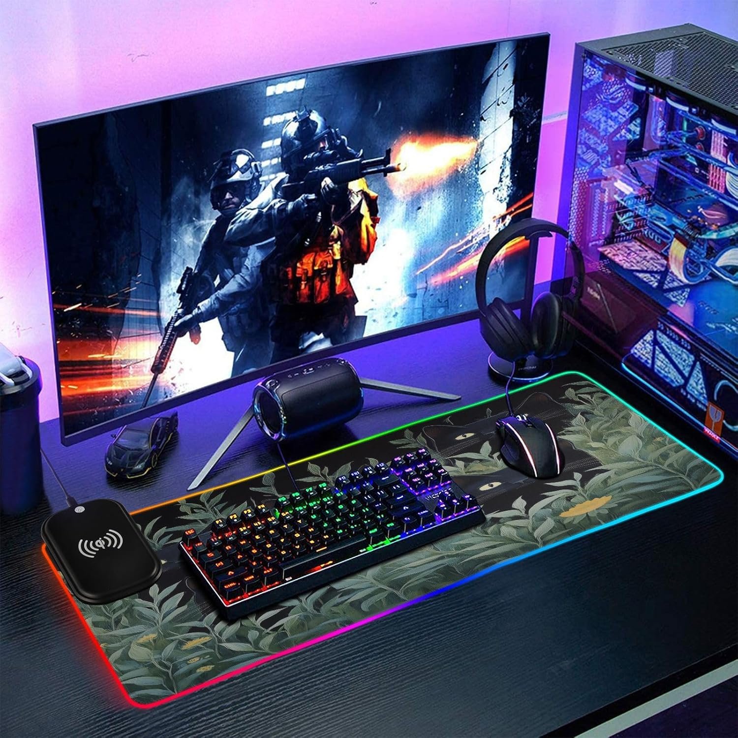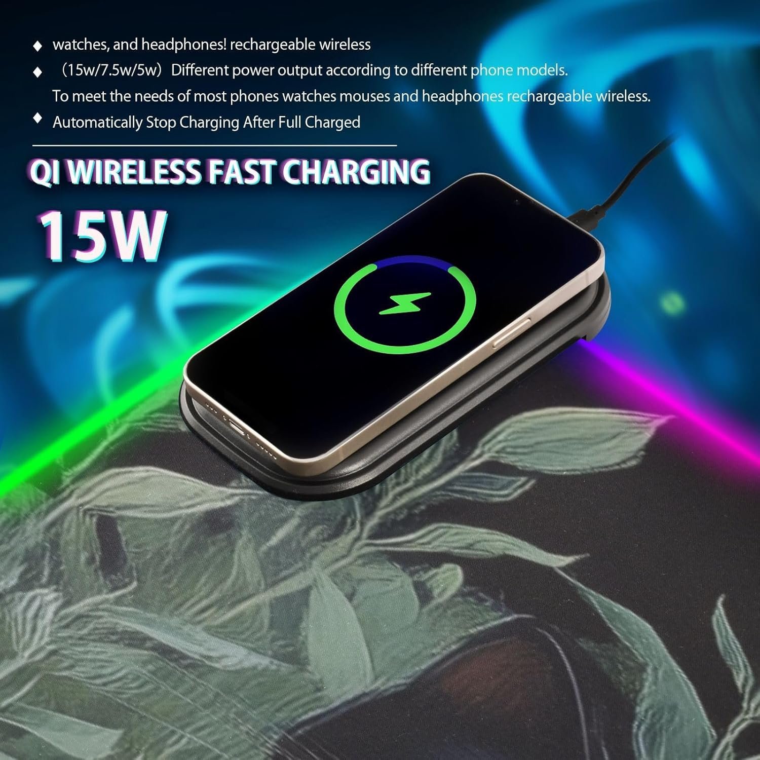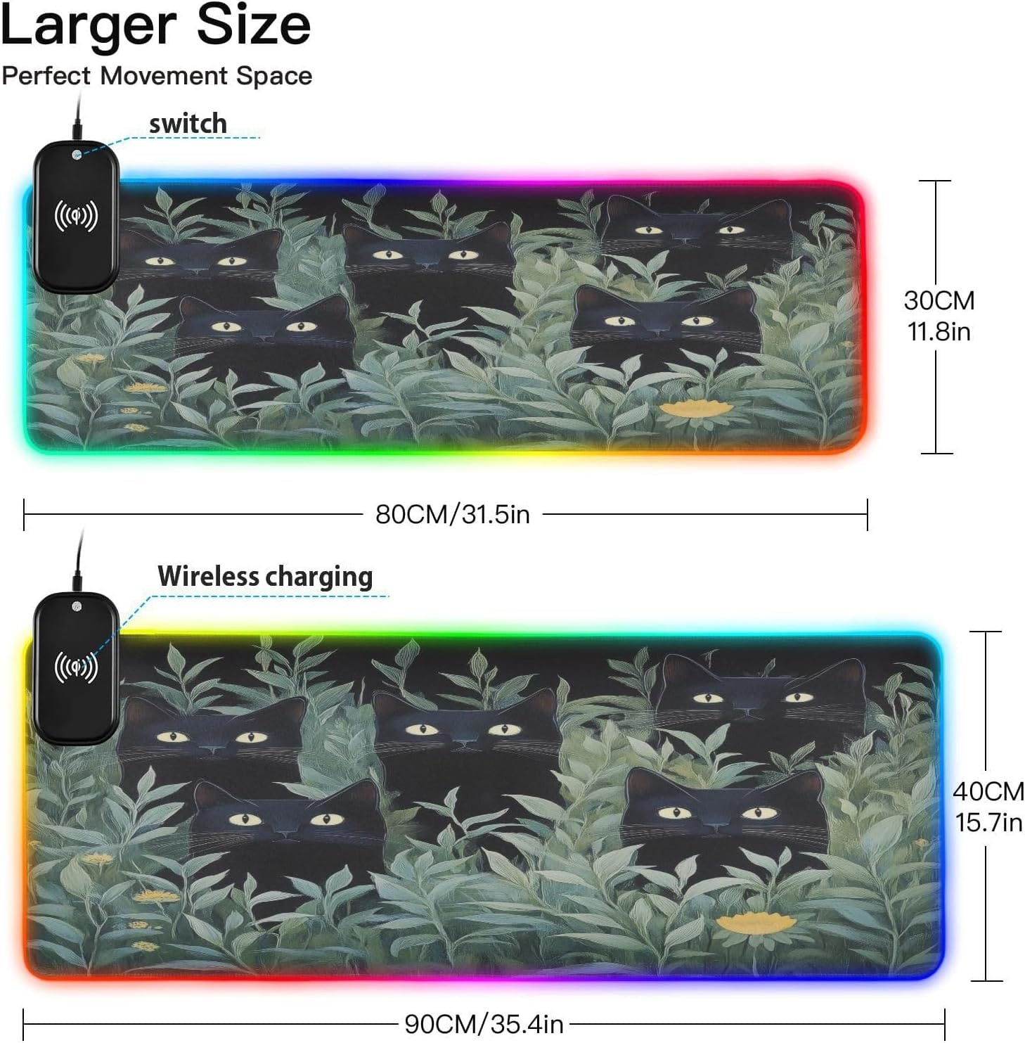 Package Including: 1 x RGB mouse pad for gaming, 1 x Fast Wireless charger (1.5m USB + Type-C cable), 1 x Instruction. Two Szies led mousepad to choose – S: 31.5 x 11.8in and M: 35.4 x 15.7in. BTW, As long as the wireless charging function of cell phone, watch, mouse and other products, can be charged with our wireless charging box.