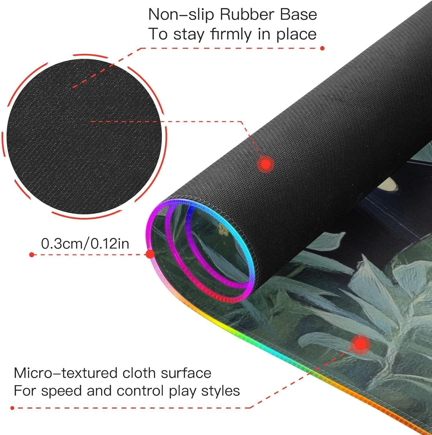 Non-slip Rubber Base: The RGB lighting do not effect interfering with your gaming experience. The mouse pad for gaming features a high-quality non-slip rubber back, ensuring it stays stable during the most intense competitions and extended gaming sessions.