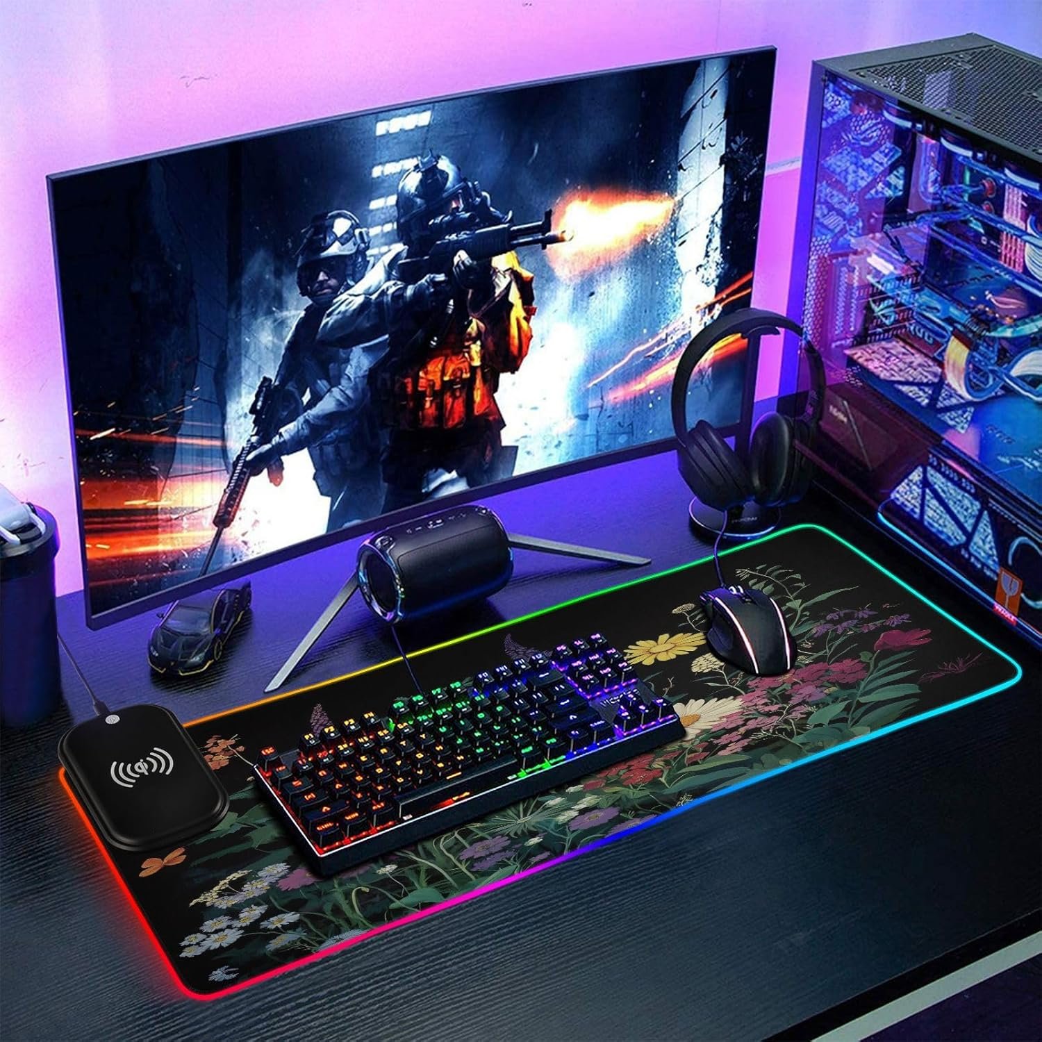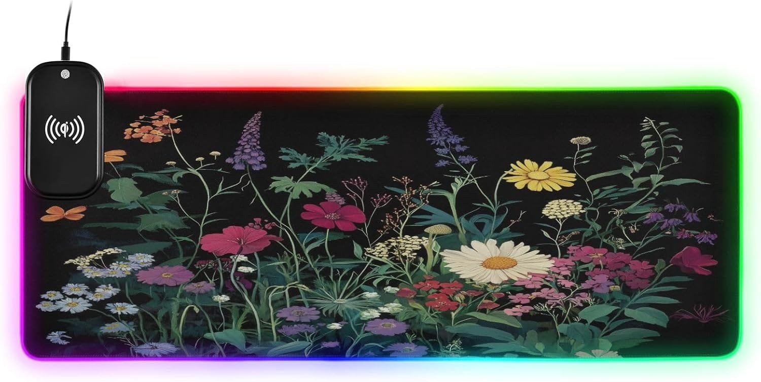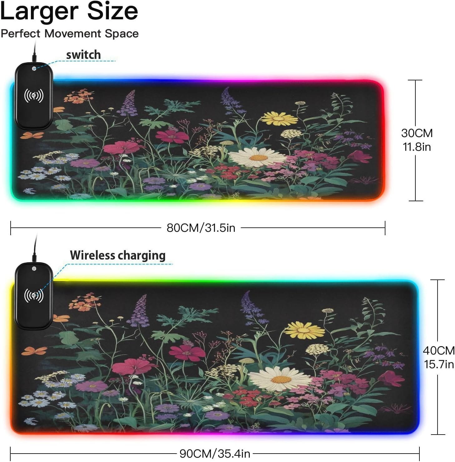 Package Including: 1 x RGB mouse pad for gaming, 1 x Fast Wireless charger (1.5m USB + Type-C cable), 1 x Instruction. Two Szies led mousepad to choose – S: 31.5 x 11.8in and M: 35.4 x 15.7in. BTW, As long as the wireless charging function of cell phone, watch, mouse and other products, can be charged with our wireless charging box.