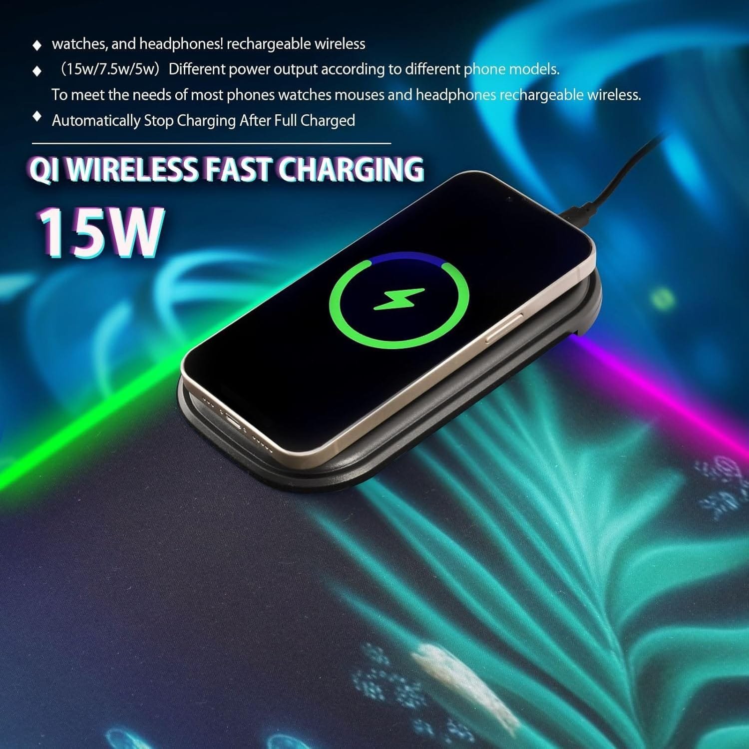 Package Including: 1 x RGB mouse pad for gaming, 1 x Fast Wireless charger (1.5m USB + Type-C cable), 1 x Instruction. Two Szies led mousepad to choose – S: 31.5 x 11.8in and M: 35.4 x 15.7in. BTW, As long as the wireless charging function of cell phone, watch, mouse and other products, can be charged with our wireless charging box.