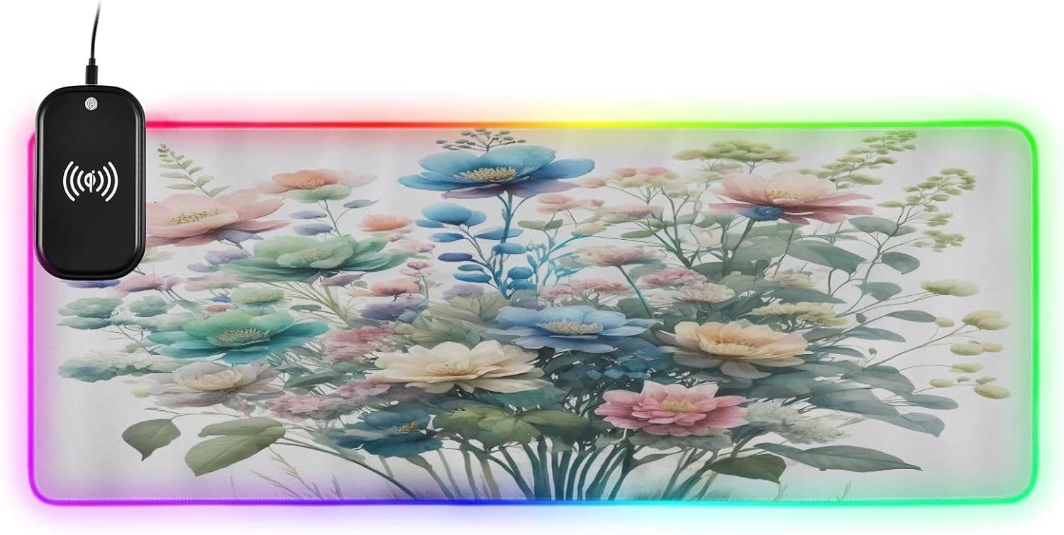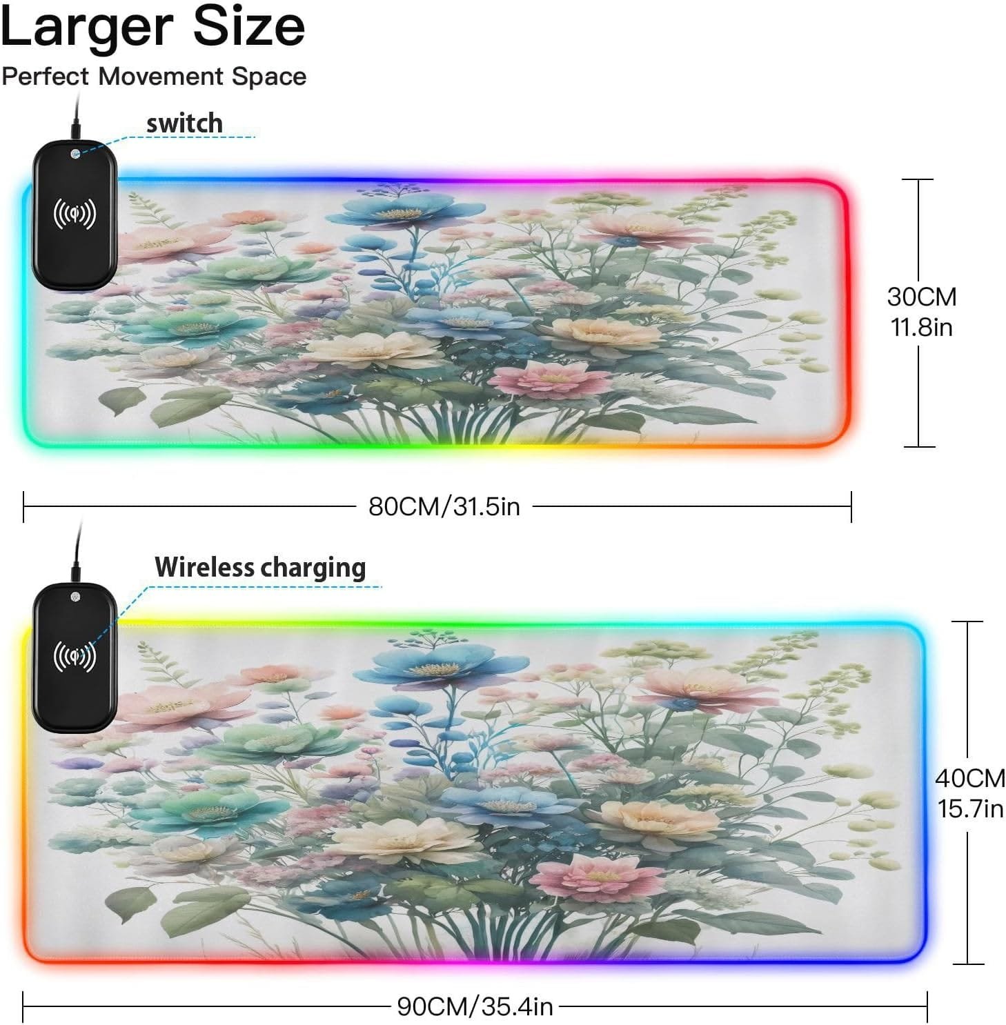 Package Including: 1 x RGB mouse pad for gaming, 1 x Fast Wireless charger (1.5m USB + Type-C cable), 1 x Instruction. Two Szies led mousepad to choose – S: 31.5 x 11.8in and M: 35.4 x 15.7in. BTW, As long as the wireless charging function of cell phone, watch, mouse and other products, can be charged with our wireless charging box.