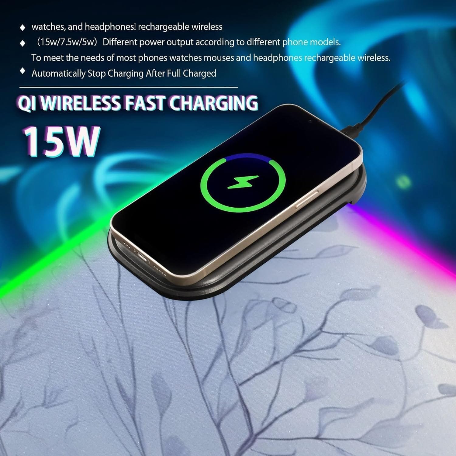 Package Including: 1 x RGB mouse pad for gaming, 1 x Fast Wireless charger (1.5m USB + Type-C cable), 1 x Instruction. Two Szies led mousepad to choose – S: 31.5 x 11.8in and M: 35.4 x 15.7in. BTW, As long as the wireless charging function of cell phone, watch, mouse and other products, can be charged with our wireless charging box.
