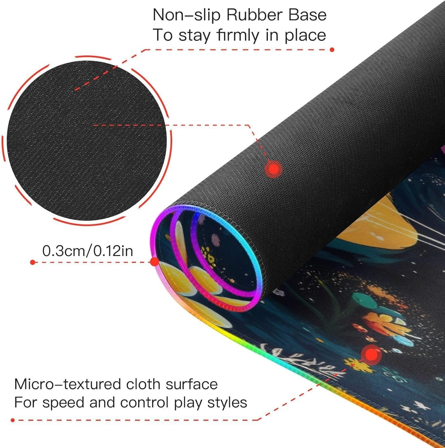 Non-slip Rubber Base: The RGB lighting do not effect interfering with your gaming experience. The mouse pad for gaming features a high-quality non-slip rubber back, ensuring it stays stable during the most intense competitions and extended gaming sessions.
