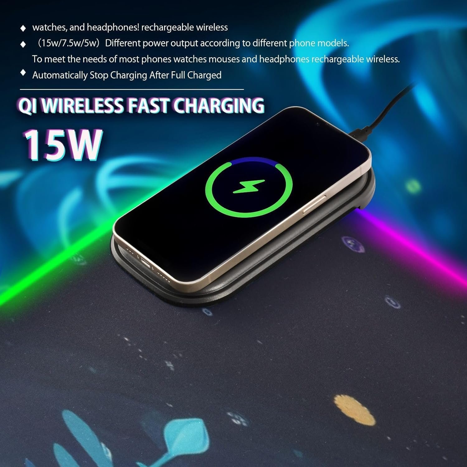 Package Including: 1 x RGB mouse pad for gaming, 1 x Fast Wireless charger (1.5m USB + Type-C cable), 1 x Instruction. Two Szies led mousepad to choose – S: 31.5 x 11.8in and M: 35.4 x 15.7in. BTW, As long as the wireless charging function of cell phone, watch, mouse and other products, can be charged with our wireless charging box.
