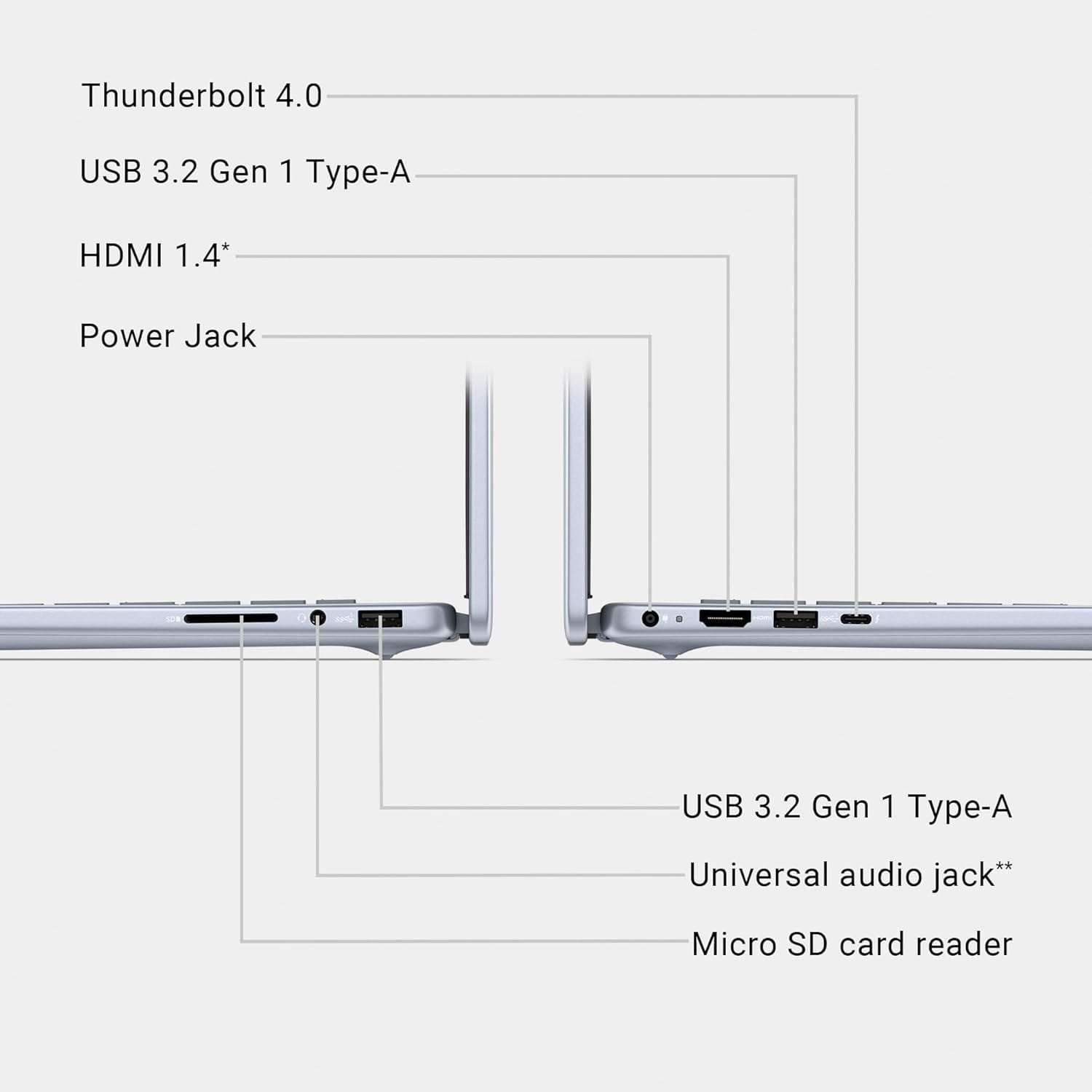 1x USB 3.2 Gen 1 Type-A, 2x USB 3.2 Gen 1 Type-C support display / power delivery, 1x 3.5mm Combo Audio Jack, Micro SD card reader, 1 x Kensington lock slot