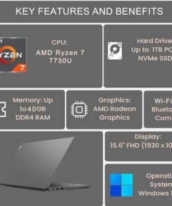 Display 15.6″ FHD (1920×1080) TN, 250nits, Anti-glare, TÜV Rheinland Low Blue Light, Non-Touch Processor AMD Octa-Core Ryzen 7 7730U Processor (8 Cores 16 Threads, 2.0Ghz base clock speed, up to 4.5Ghz, 16MB cache) Graphics Integrated AMD Radeon Graphics RAM 40GB DDR4 3200MHz SO-DIMM RAM Memory Speed 3200MHz Storage 1TB SSD M.2 2280 PCIe 4.0×4 Performance NVMe Networking Intel Wi-Fi 6 802.11ax 2×2 + Bluetooth5.2 Operating System Windows 11 Pro 64-bit Battery 3-Cell 38Wh Battery, 65W AC Power Adapter Camera HD 720p Privacy Shutter Keyboard 6-row, spill-resistant, multimedia Fn keys, SMB Service Hot key, numeric keypad, Non-backlight Security Firmware TPM 2.0 integrated in SoC, Kensington Nano Security Slot, 2.5 x 6 mm Dimensions 14.14 x 9.28 x 0.78 inches Weight 3.64 lbs Touchpad Buttonless Mylar surface multi-touch touchpad, supports Precision TouchPad (PTP)