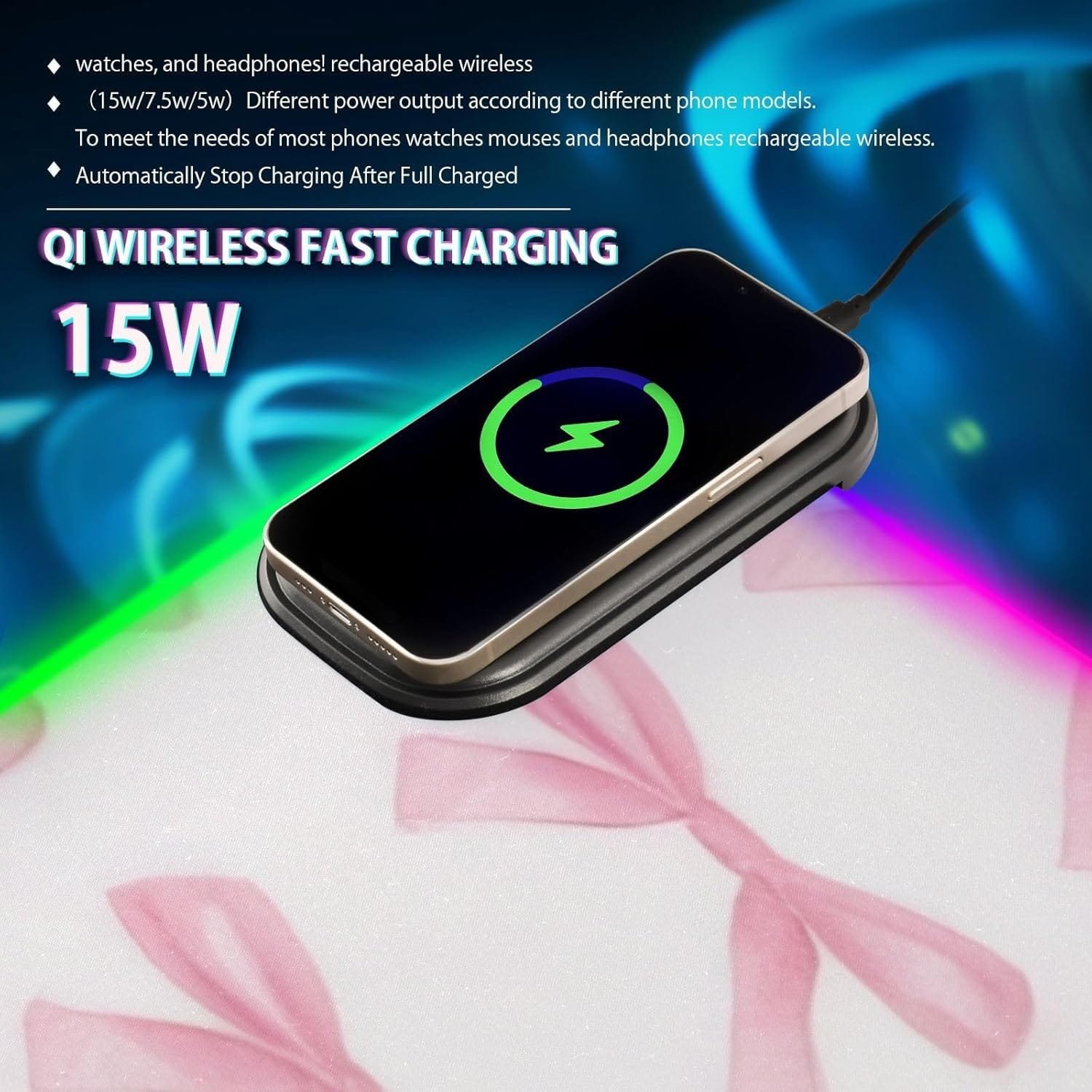 Package Including: 1 x RGB mouse pad for gaming, 1 x Fast Wireless charger (1.5m USB + Type-C cable), 1 x Instruction. Two Szies led mousepad to choose – S: 31.5 x 11.8in and M: 35.4 x 15.7in. BTW, As long as the wireless charging function of cell phone, watch, mouse and other products, can be charged with our wireless charging box.