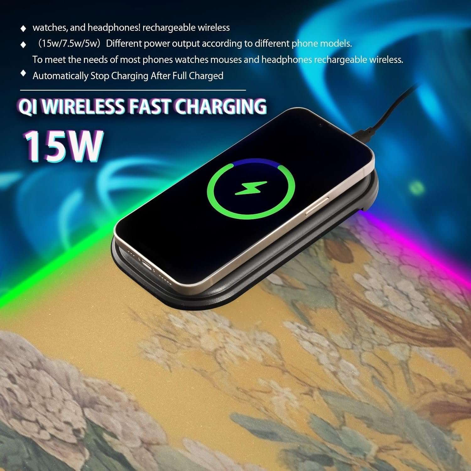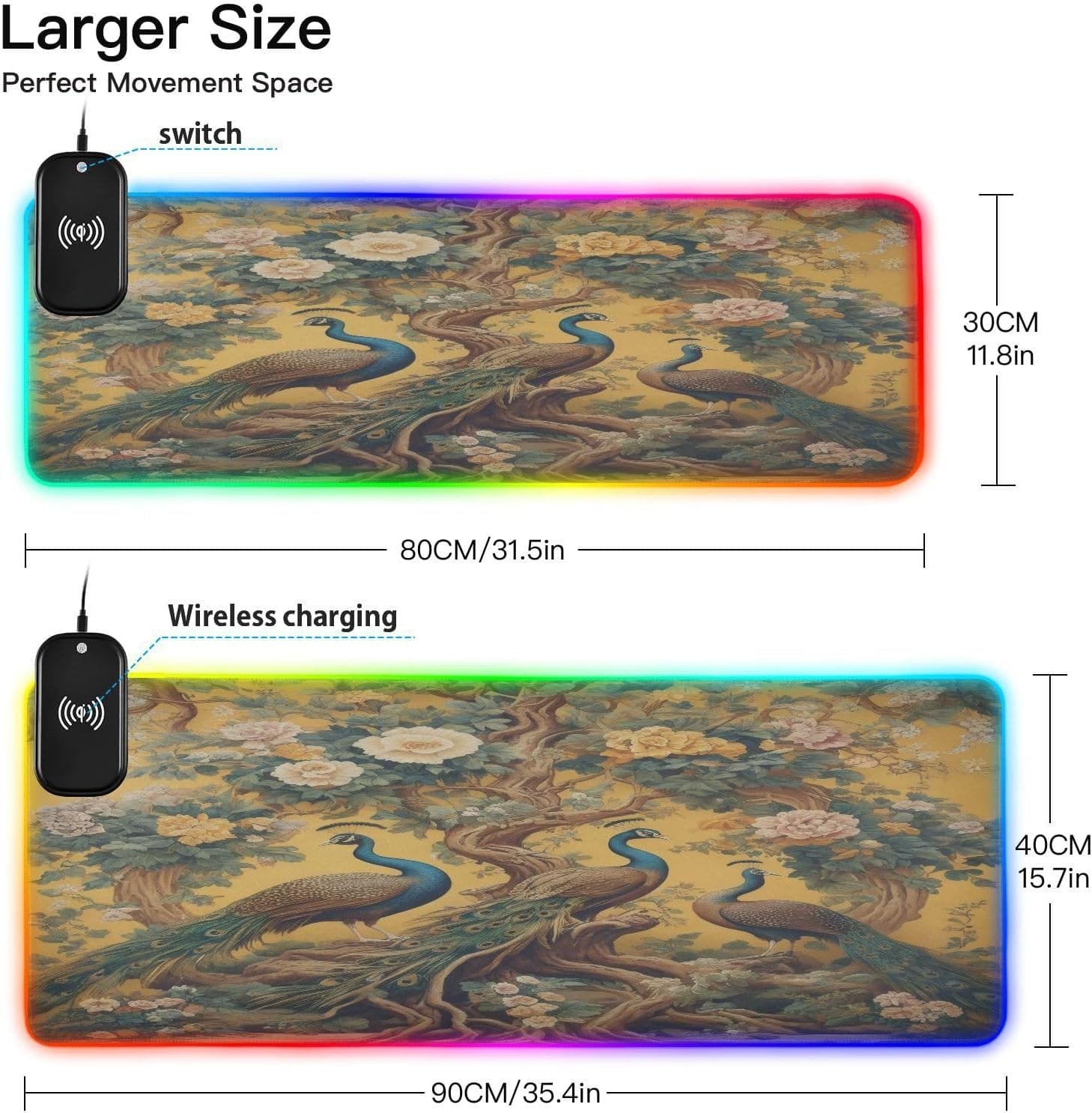 Package Including: 1 x RGB mouse pad for gaming, 1 x Fast Wireless charger (1.5m USB + Type-C cable), 1 x Instruction. Two Szies led mousepad to choose – S: 31.5 x 11.8in and M: 35.4 x 15.7in. BTW, As long as the wireless charging function of cell phone, watch, mouse and other products, can be charged with our wireless charging box.