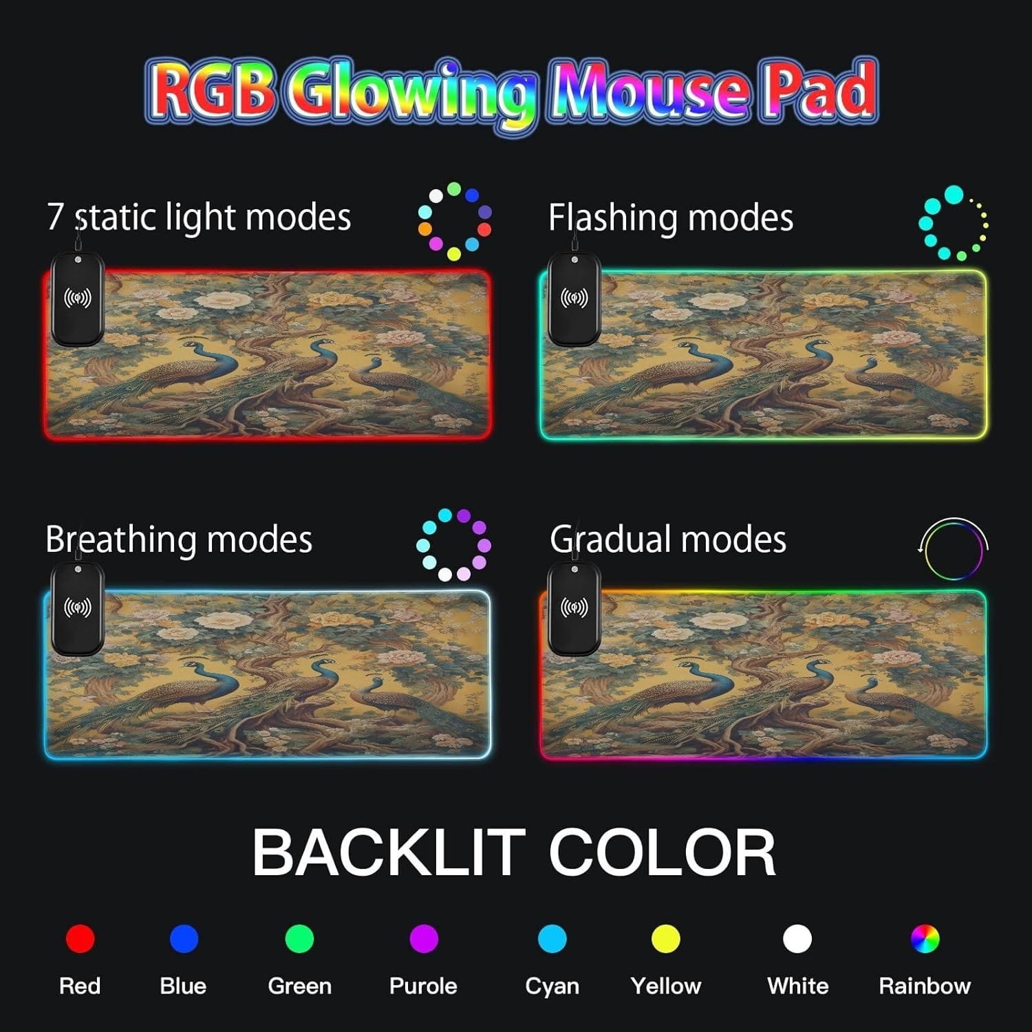 Fantasy Tree with Peacocks Blooming Flowers Gaming Mouse Pad Led Mousepads RGB Backlit with 14 Lighting Modes, Non Slip Base Soft Computer Keyboard Mat for Gaming PC Laptop Desk, S