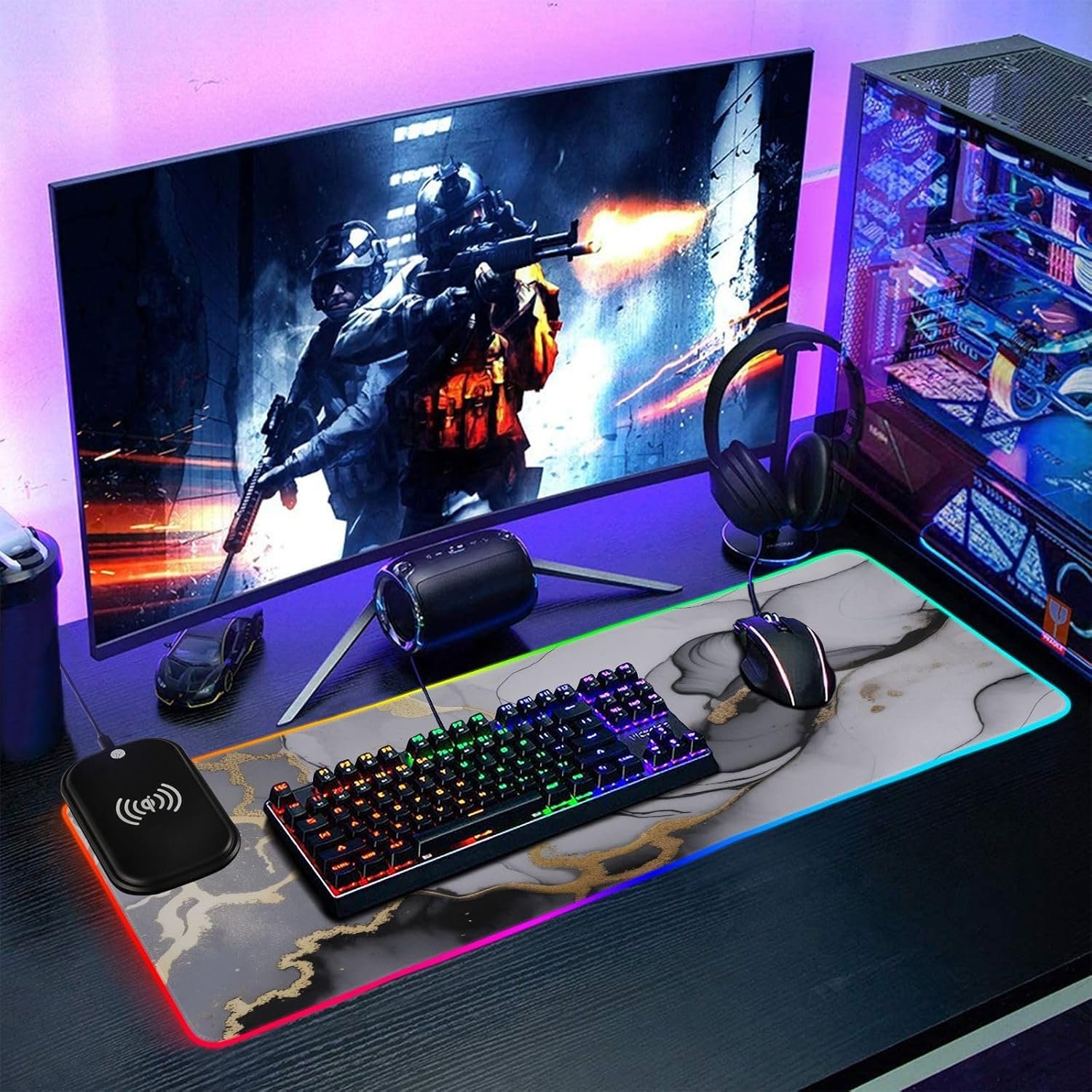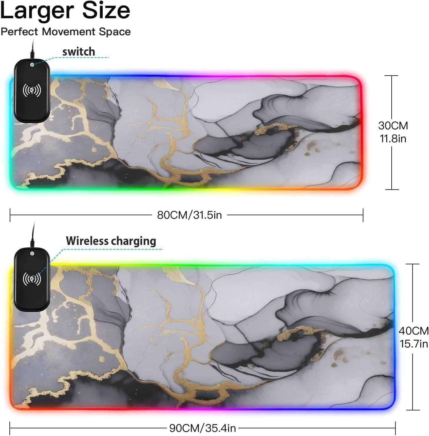 Package Including: 1 x RGB mouse pad for gaming, 1 x Fast Wireless charger (1.5m USB + Type-C cable), 1 x Instruction. Two Szies led mousepad to choose – S: 31.5 x 11.8in and M: 35.4 x 15.7in. BTW, As long as the wireless charging function of cell phone, watch, mouse and other products, can be charged with our wireless charging box.