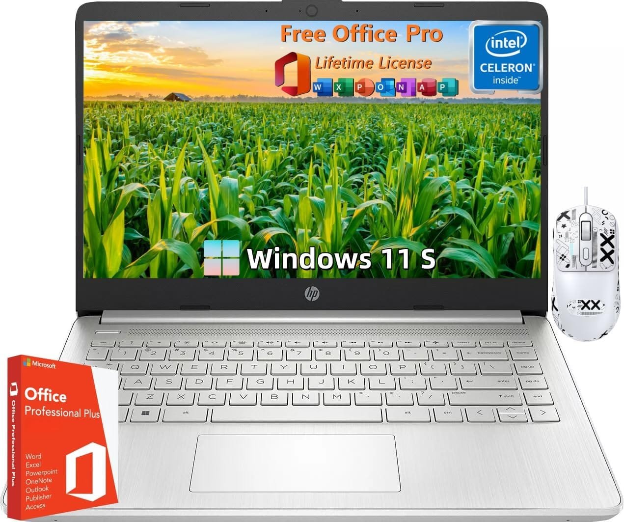 HP 14″ Laptop for Student Business, with Office Lifetime License & Windows 11 S, Intel Dual-Core N4120, 16 GB RAM, 384 GB Storage(128GB eMMC+256GB Micro SD), Ultra Light, Webcam, WiFi, HDMI, Silver
