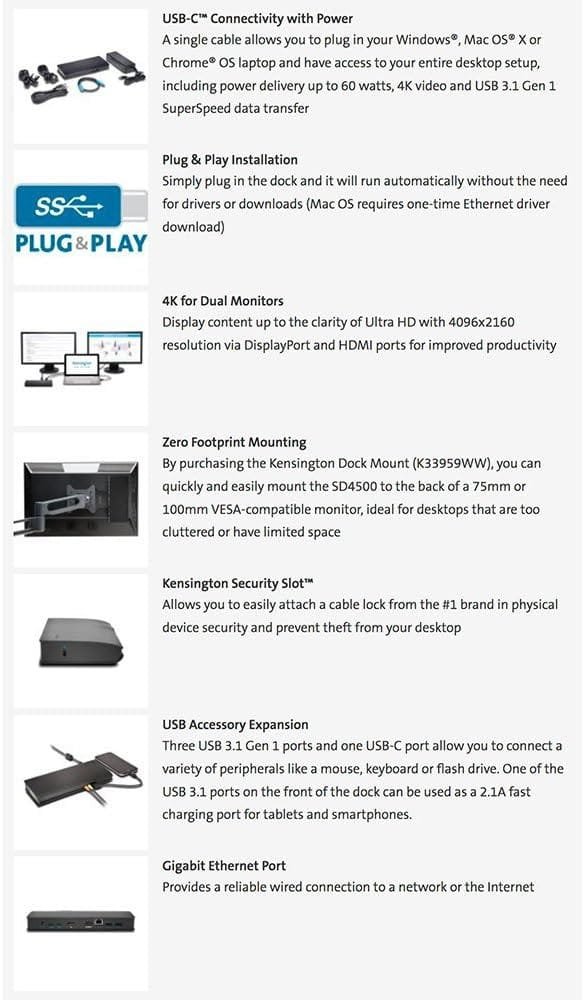 Features three USB 3. 1 Gen 1 ports for peripheral accessories (delivering data speeds up to 5Gbps), one USB-C port, Gigabit Ethernet port (Mac devices require a one-time Ethernet driver download at installation), 3. 5mm headphone and microphone jacks, and Kensington security slot.