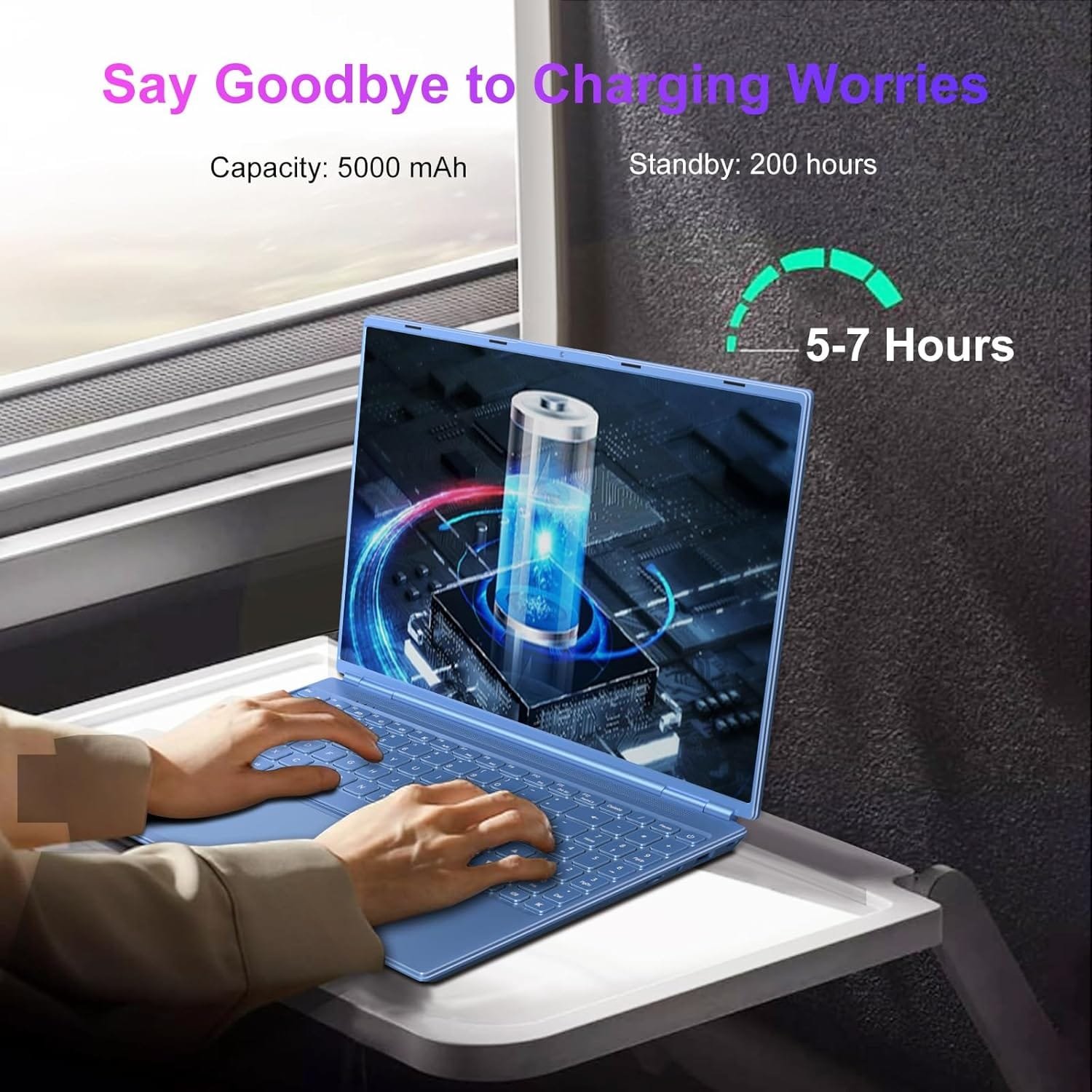 Long Battery Life and Package:This versatile laptop is ideal for both business and home use. It features an advanced 5000mWh rechargeable battery, offering impressive battery life of 5-7 hours, making it ideal for work or travel. The packaging includes a wireless mouse, a 12V DC charger, and a user manual, ensuring you have everything you need right out of the box
