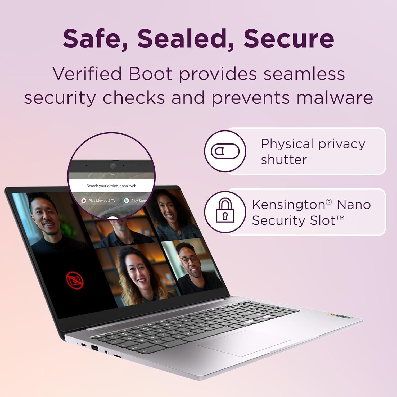 The Lenovo 3i Chromebook (15″ Intel) has your cybersecurity needs covered. Keep calm and stay focused on your tasks at hand—as the Chromebook starts up, it goes through Verified Boot—a rigorous and seamless security check in the background that prevents malware and automatically switches back to a previous version of the system if anything suspicious is detected.
