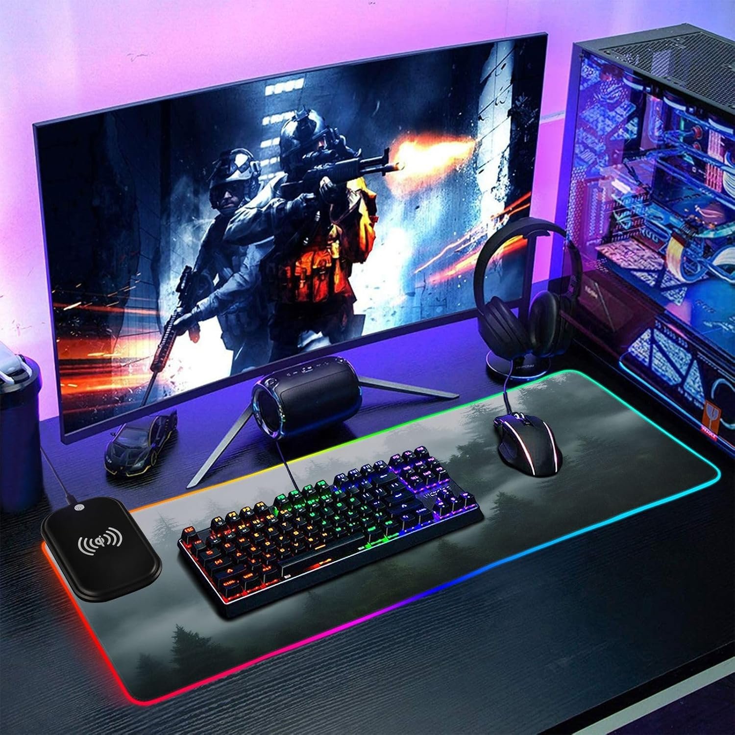 Package Including: 1 x RGB mouse pad for gaming, 1 x Fast Wireless charger (1.5m USB + Type-C cable), 1 x Instruction. Two Szies led mousepad to choose – S: 31.5 x 11.8in and M: 35.4 x 15.7in. BTW, As long as the wireless charging function of cell phone, watch, mouse and other products, can be charged with our wireless charging box.
