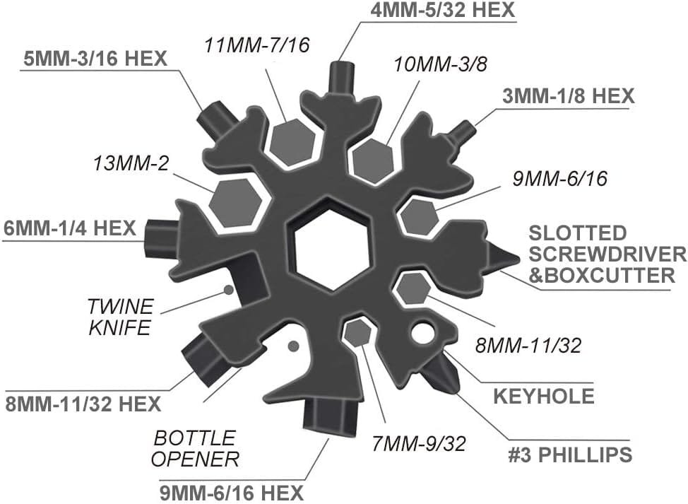 Saker 18-in-1 Snowflake Multi-Tool features incredible 18 tools, flathead screwdrivers, # 3 and # 2 Phillips screwdrivers, 4, 5 and 6mm Allen screws, 1/4 box cutter in end keys 7, 8, 10, 11, 12, 13 and 14 mm end key.
