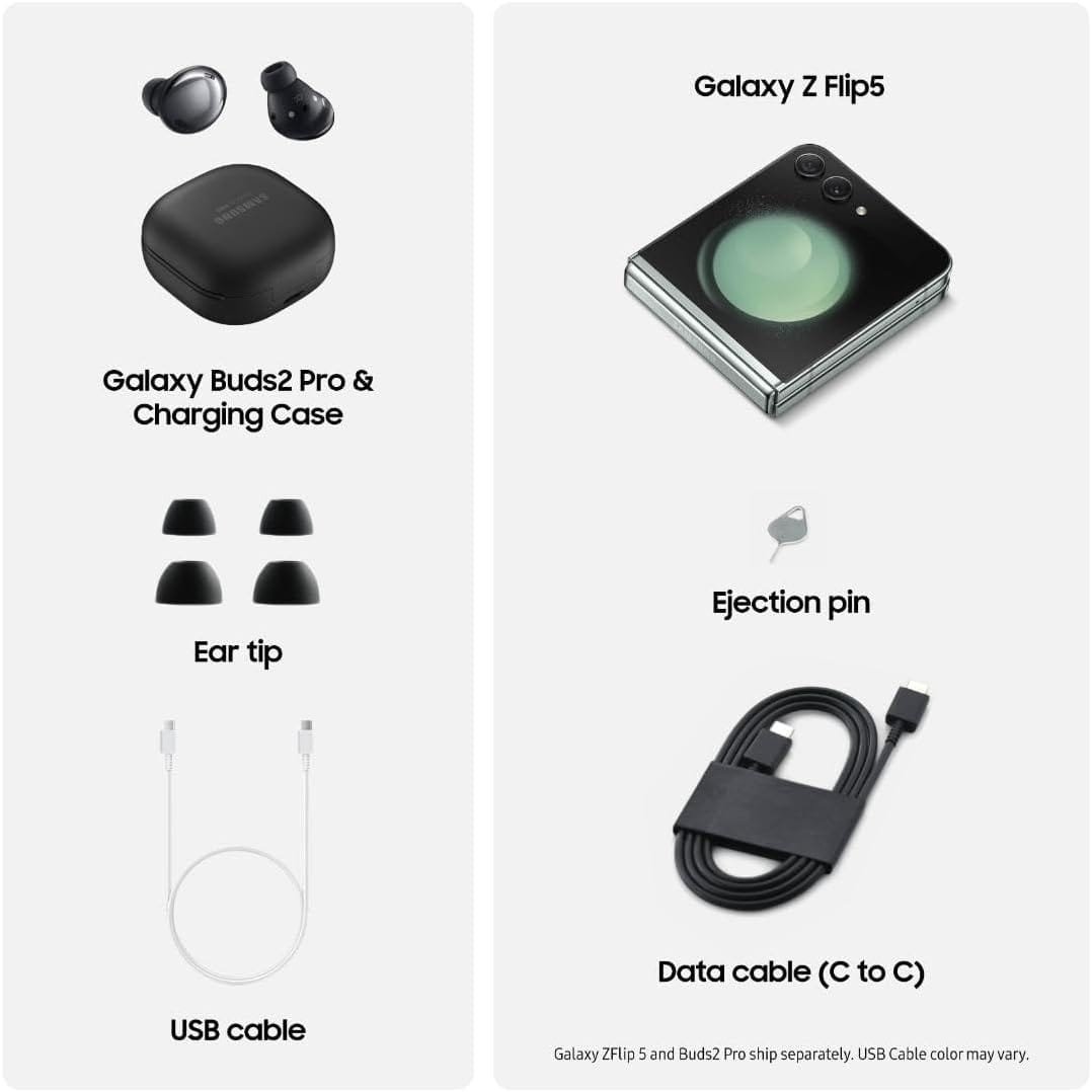 WHAT’S IN THE BUNDLE: Samsung Galaxy Z Flip5 Cell Phone with Data Cable (C to C) and Ejection Pin + Buds2 Pro, Charging Case, Ear Tips (2)