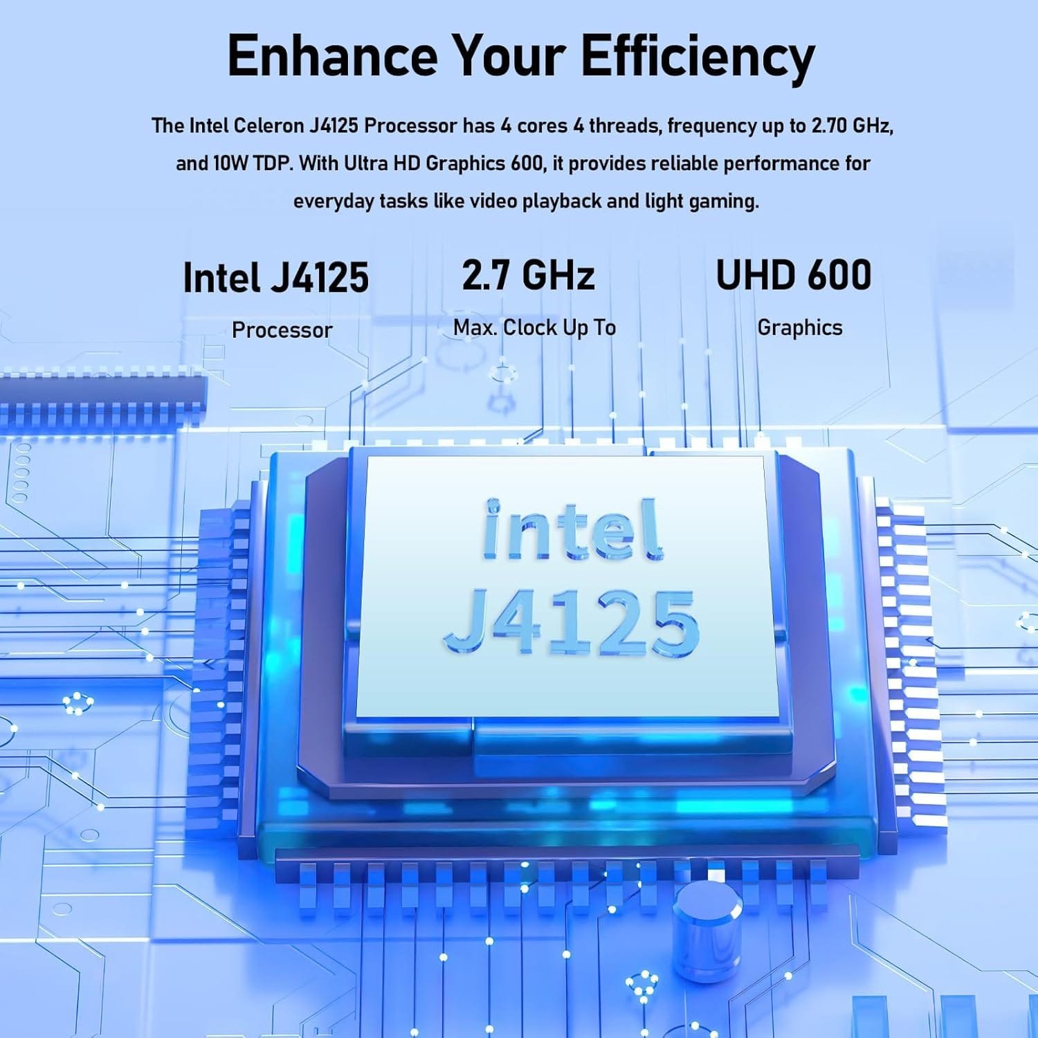Enjoy fast and smooth performance with the Intel Celeron J4105 processor, featuring 2.50 GHz burst frequency, 1.50 GHz Base Frequency, 10 W TDP, 14 nm lithography, and 4 cores and 4 threads for multitasking. Enhance your visual experience on laptop computers with Intel UHD Graphics 600, offering up to 8 GB of video memory, 750 MHz Burst Frequency and 4k video output for up to 3 monitors.