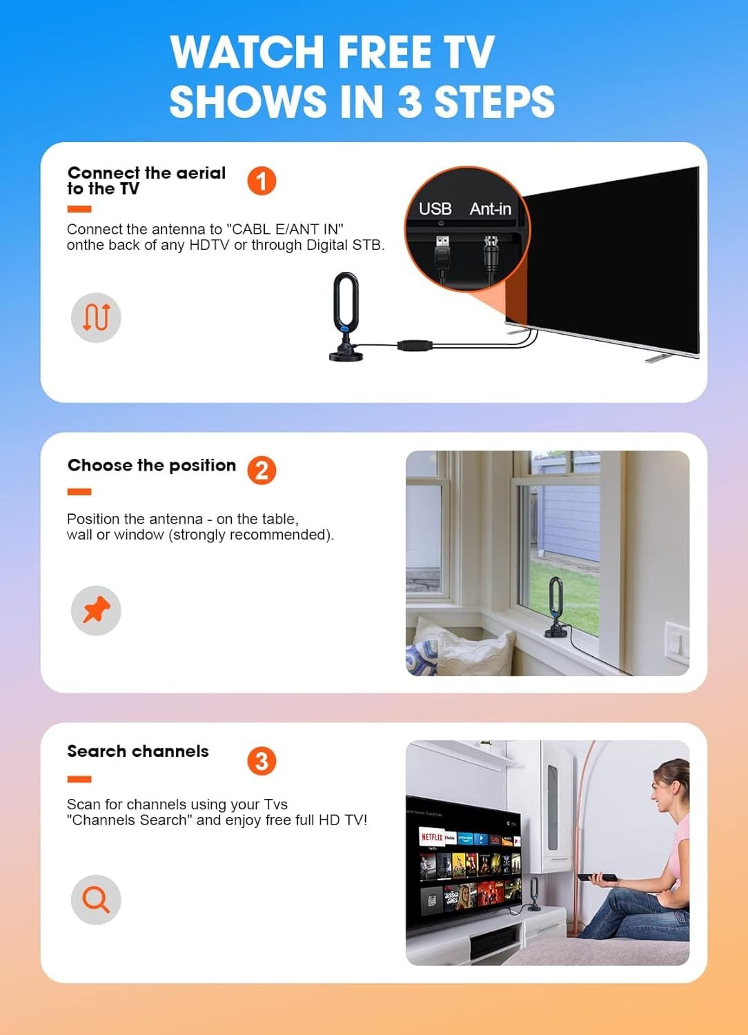 I setup the antenna as directed and placed it in a window. Went into the TV setup to over the air channels and scanned. The scan picked up exactly zero channels. May just be my area but it didn’t even pick up anything, not even channels from my city that pretty much every gets with an antenna. Would not recommend.